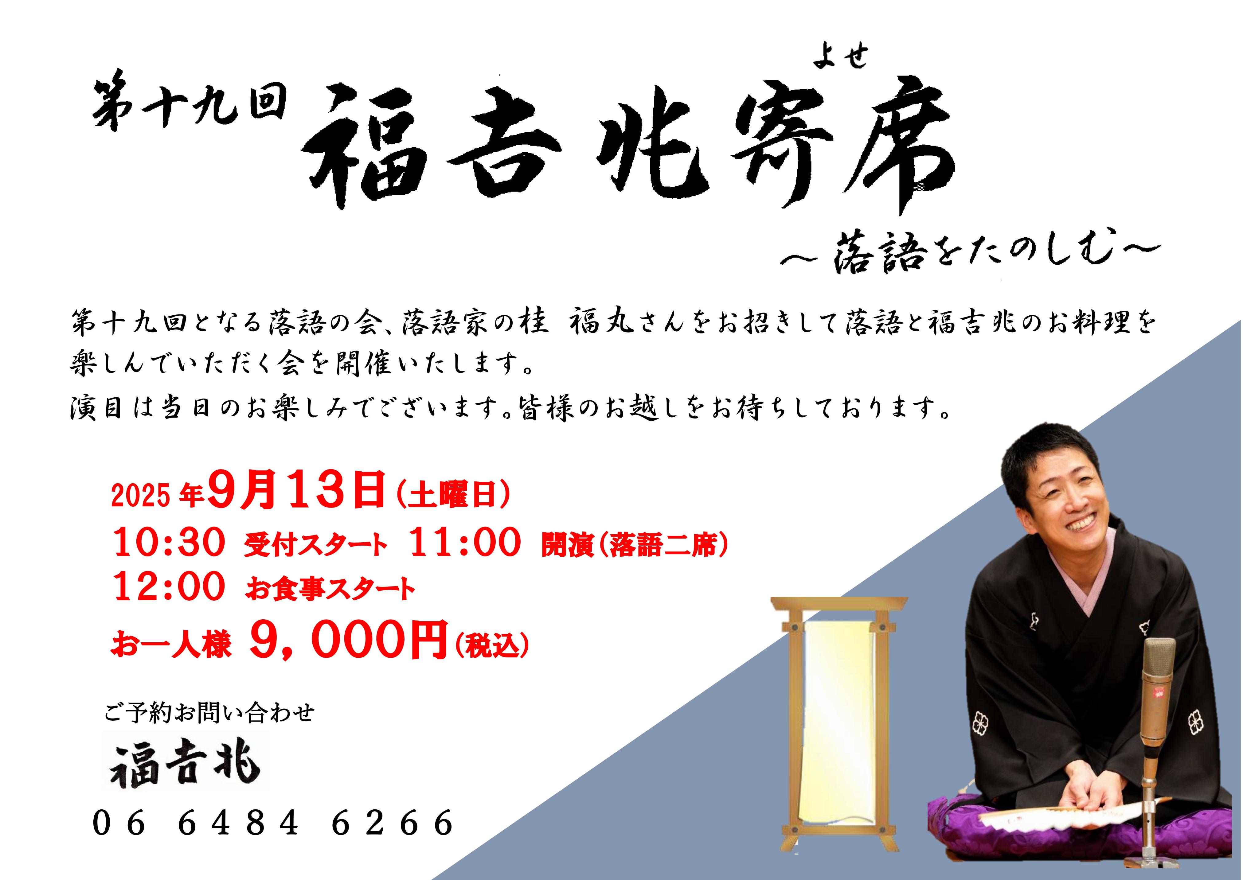 Home › 第19回福吉兆寄席 <肥後橋> 第19回福吉兆寄席 <肥後橋> Calendar いつ: 2025年9月13日 @ 11:00 AM 2025-09-13T11:00:00+09:00 2025-09-13T11:15:00+09:00 どこで: 福吉兆 日本、〒530-0005 大阪府大阪市北区中之島3丁目2−4 中之島フェスティバルタワー・ウエスト 2F 料金: 9,000円(限定15名様) 連絡先: 福吉兆 06-6484-6266 イベント 落語会 ランチ 上方落語 地域寄席 寄席 寄席好きとつながりたい 桂福丸 福吉兆 落語 落語会 落語好きとつながりたい 食事付落語会 出演:桂福丸(2席) 季節のお料理コース付 2018年06月08日 | Posted in | | Comments Closed 関連記事 全部豚まん!? 市川市歯科医師会さん・イビキのイベントに! 京都・元有隣小学校にて敬老落語 シャボン玉石けんさんの工場へ! 強烈!福笑師匠の会に!