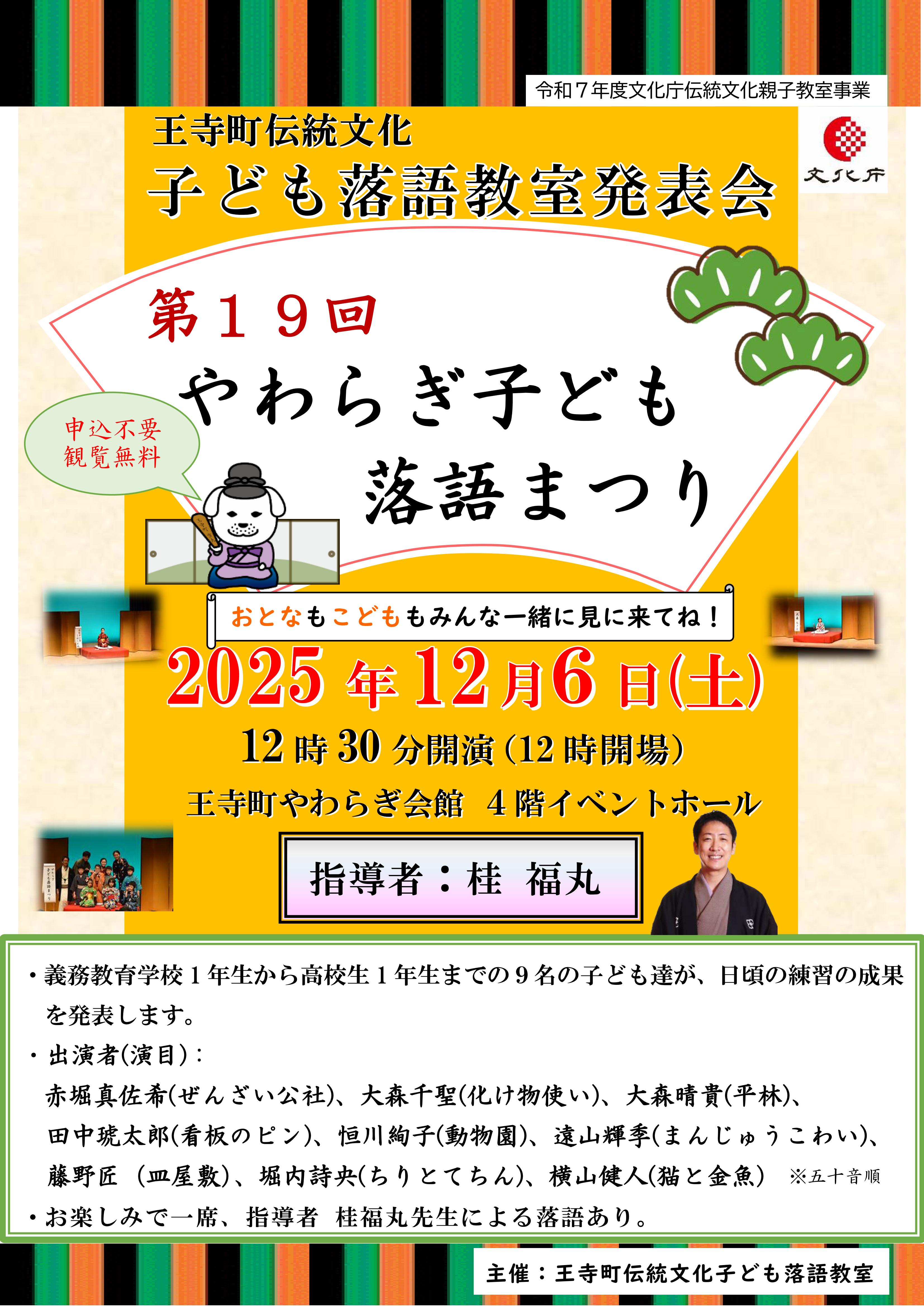 Home › 第19回やわらぎ子ども落語まつり<奈良県王寺町・やわらぎ会館> 第19回やわらぎ子ども落語まつり<奈良県王寺町・やわらぎ会館> Calendar いつ: 2025年12月6日 @ 12:30 PM 2025-12-06T12:30:00+09:00 2025-12-06T12:45:00+09:00 どこで: やわらぎ会館ホール 日本、〒636-0002 奈良県北葛城郡王寺町王寺2丁目1−18 料金: 無料 連絡先: やわらぎ会館 0745-31-5555 Eメール イベント 落語会 お囃子 やわらぎ会館 上方落語 伝統芸能 地域寄席 奈良県 子ども落語 子ども落語教室 寄席 寄席好きとつながりたい 桂福丸 王寺町 落語 落語会 落語好きとつながりたい 2023年06月16日 | Posted in | | Comments Closed 関連記事 全部豚まん!? 市川市歯科医師会さん・イビキのイベントに! 京都・元有隣小学校にて敬老落語 シャボン玉石けんさんの工場へ! 強烈!福笑師匠の会に!