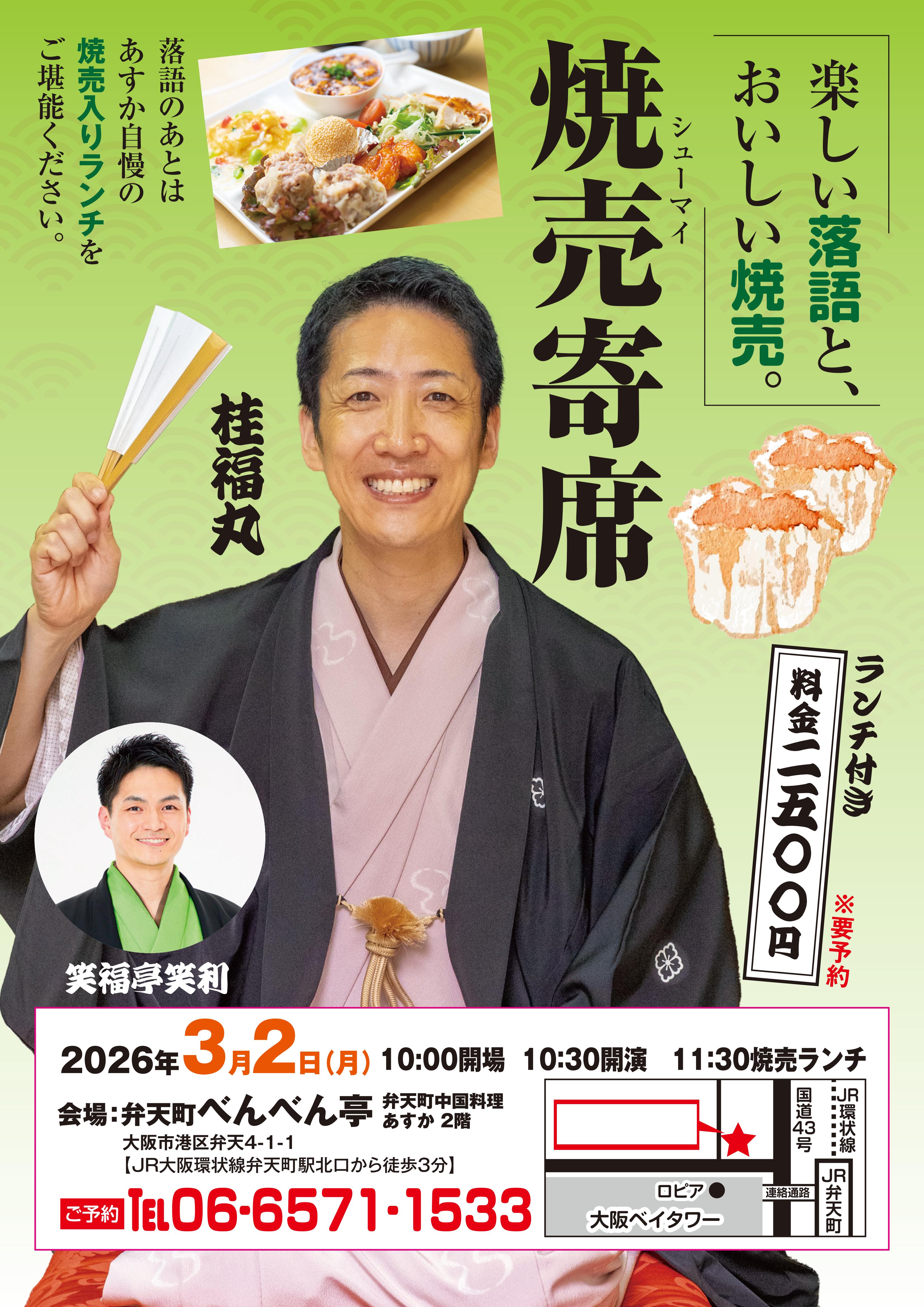 Home › ランチ付き焼売寄席<弁天町>3月席 ランチ付き焼売寄席<弁天町>3月席 Calendar いつ: 2026年3月2日 @ 10:30 AM 2026-03-02T10:30:00+09:00 2026-03-02T10:45:00+09:00 どこで: 弁天町中国料理あすか2F 日本、〒552-0007 大阪府大阪市港区弁天4丁目1−1 料金: 2,500円(焼売ランチ付) 連絡先: あすか(土日祝休み) 0665711533 イベント 落語会 あすか べんべん亭 ランチ ランチ付き 上方落語 中国料理 伝統芸能 地域寄席 大阪 大阪市港区 寄席 寄席好きとつながりたい 弁天町 桂福丸 港区 焼売 笑福亭笑利 落語 落語会 落語好きとつながりたい 名物の焼売ランチが付いた お昼の落語会!! 出演:桂福丸・笑福亭笑利 2019年12月07日 | Posted in | | Comments Closed 関連記事 全部豚まん!? 市川市歯科医師会さん・イビキのイベントに! 京都・元有隣小学校にて敬老落語 シャボン玉石けんさんの工場へ! 強烈!福笑師匠の会に!